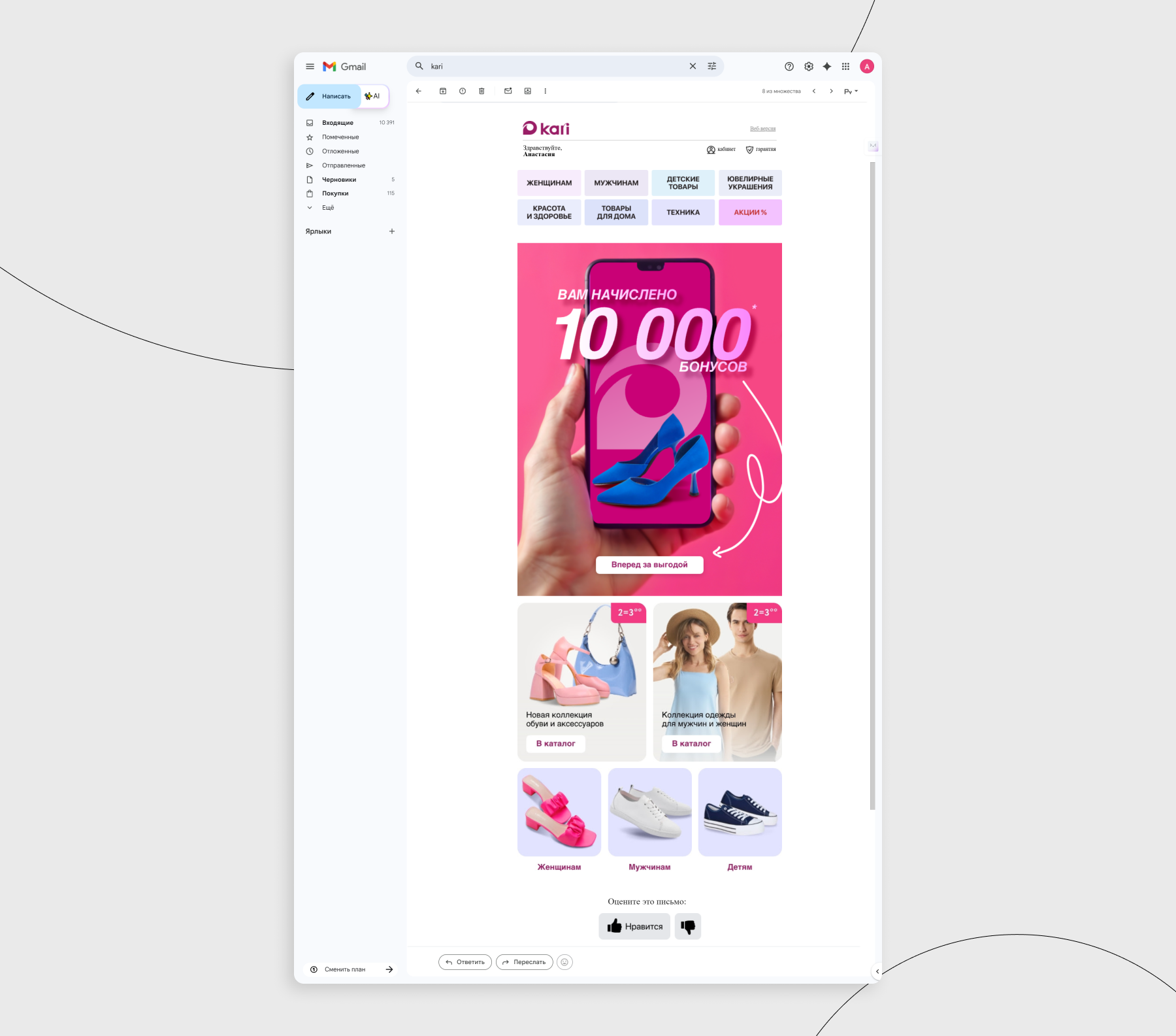 Подписчики получают персонализированные сообщения, которые учитывают демографические характеристики, интерес к отдельным категориям, историю покупок и другие данные, в том числе из офлайна. Благодаря CDP данные обновляются в реальном времени. kari активно применяет практику кросс-продаж: в письмо всегда добавляют товары из нескольких категорий, которые интересны получателю.
