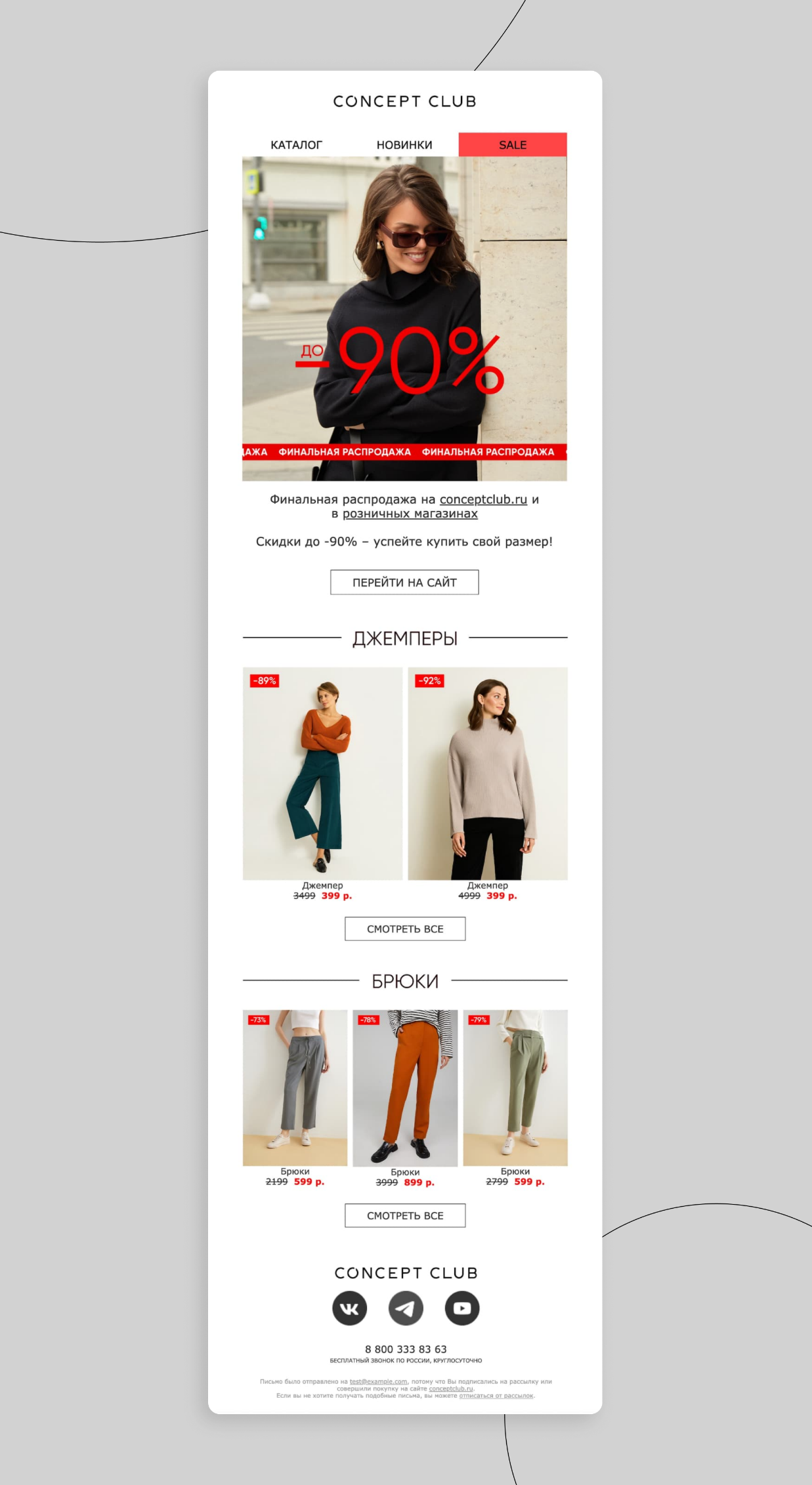 Concept Club — бренд женской одежды с продажами онлайн и офлайн. Магазин делает рассылки на отдельные сегменты. Например, тюменцы получают анонсы акций, которые проходят в их городе. Участники программы лояльности премиум-уровня получают письма с особыми предложениями, а те, кто давно не открывал письма, — активирующую рассылку. Гибкая сегментация позволяет исключить людей, которые выполнили целевое действие за определенный период.