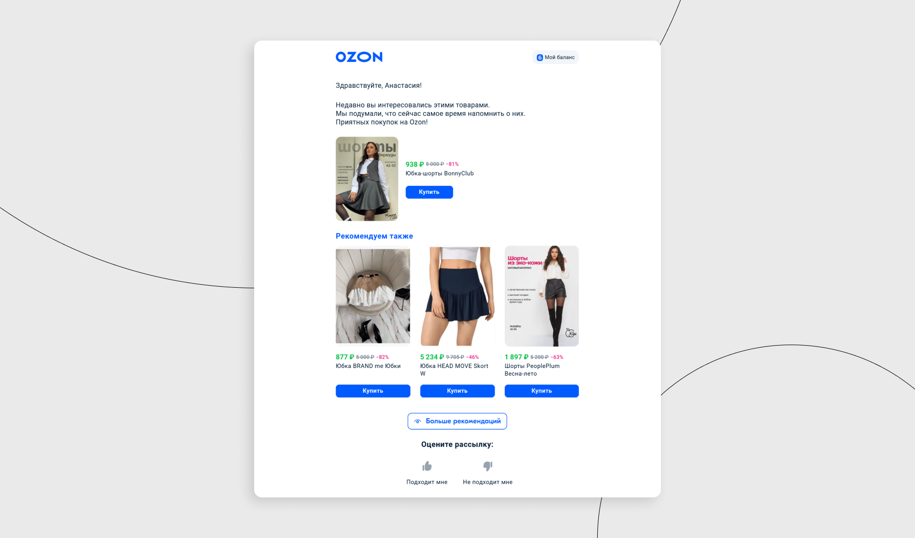 На основе этих данных интернет-магазин может формировать точные сегменты и предлагать релевантные продукты: рекомендации «вам может понравиться», подборки по прошлым покупкам, персональные скидки или напоминания о пополнении запасов.