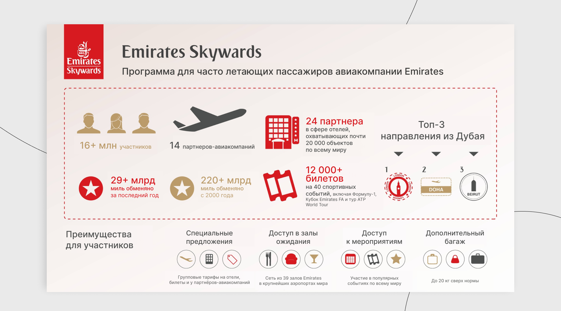 Накопленные мили можно обменивать на премиальные билеты Emirates, повышение класса обслуживания или рейсы других авиакомпаний. В программе предусмотрен семейный аккаунт: бонусы всех членов семьи суммируются, что позволяет быстрее накапливать и использовать мили.
