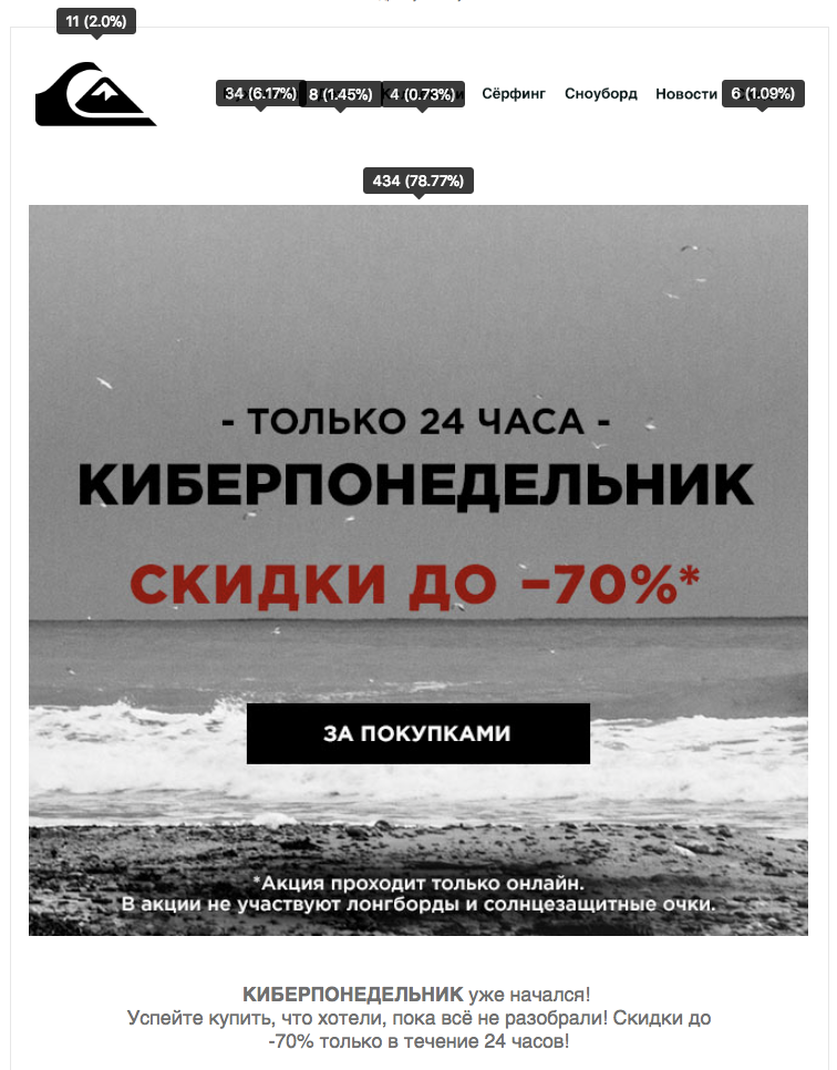 Онлайн-магазины выбрали один из самых действенных способов повысить продажи — провести грандиозный «киберпонедельник», краткосрочную акцию, во время которой на часть товаров действует большая скидка. В качестве анонсирующего канала был использован сервис email-рассылок REES46.