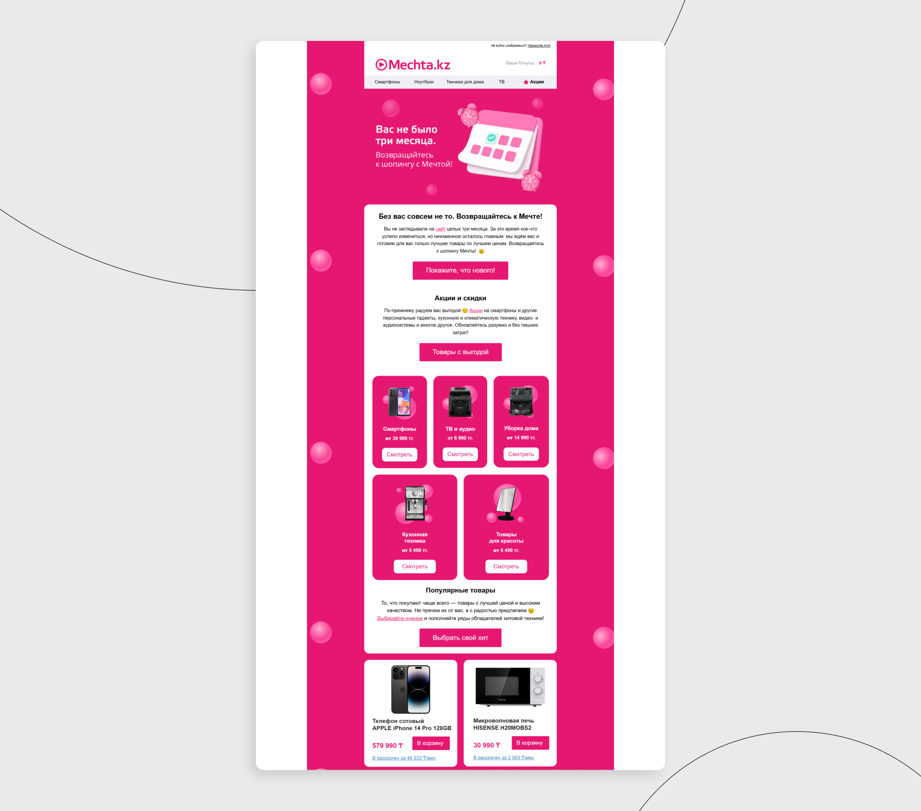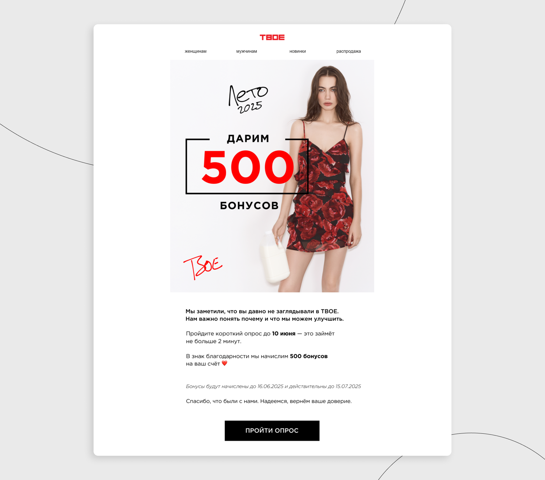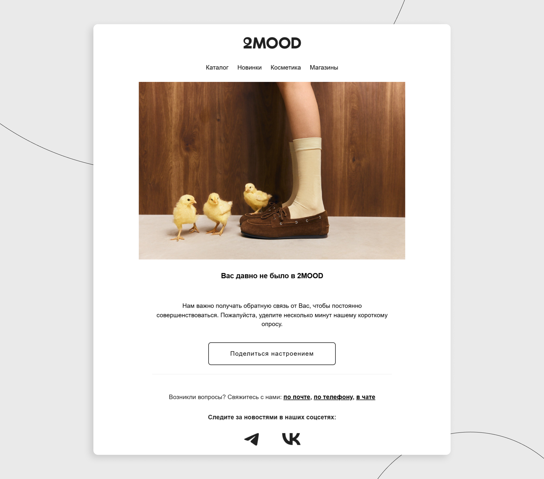 - Потеря интереса → контентные письма, подборки новинок, полезные материалы;
