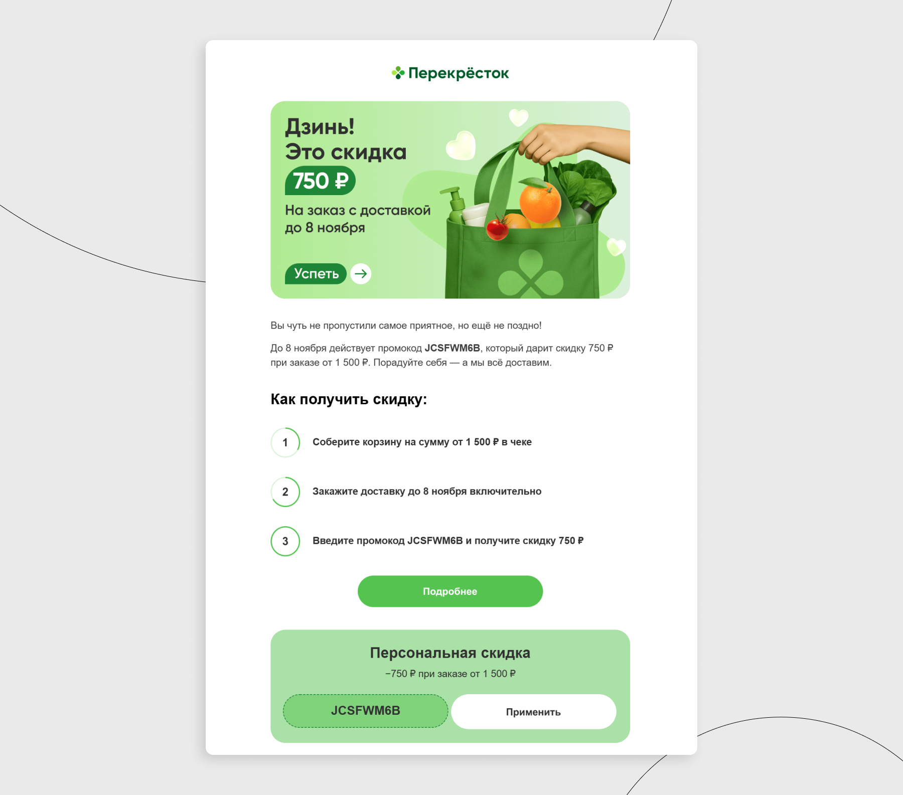 Персональные предложения остаются одним из самых результативных способов вернуть интерес клиента. Важно не просто предложить скидку, а дать ценность, основанную на поведении и истории покупок.