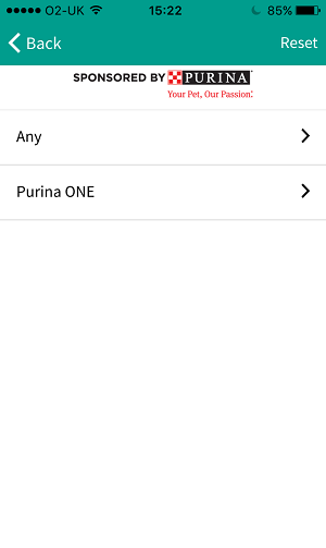 А теперь внимание на фильтр. Отфильтровать по привычным параметрам можно: доступны такие фильтры, как «тип», «бренд», «возраст питомца», «вкус», «размер пакета». С одним «но» — сначала придется выбрать среди «Purina» и «всё остальное». Таким образом приложение воздает почести спонсору — показывая, что есть бренд, для которого мы сделали отдельный раздел, а есть прочие, которые не настолько интересны.