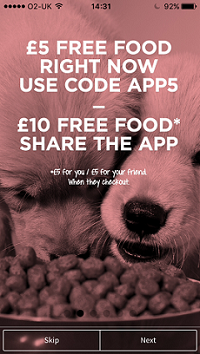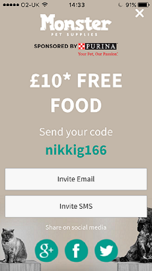 Тут всё просто. У пользователя, скачавшего приложение, есть промо-код. Он приглашает друга тоже скачать приложение (можно отправить приглашение по емейлу или SMS) — они оба получают бесплатного корма каждый на 5 фунтов стерлингов.